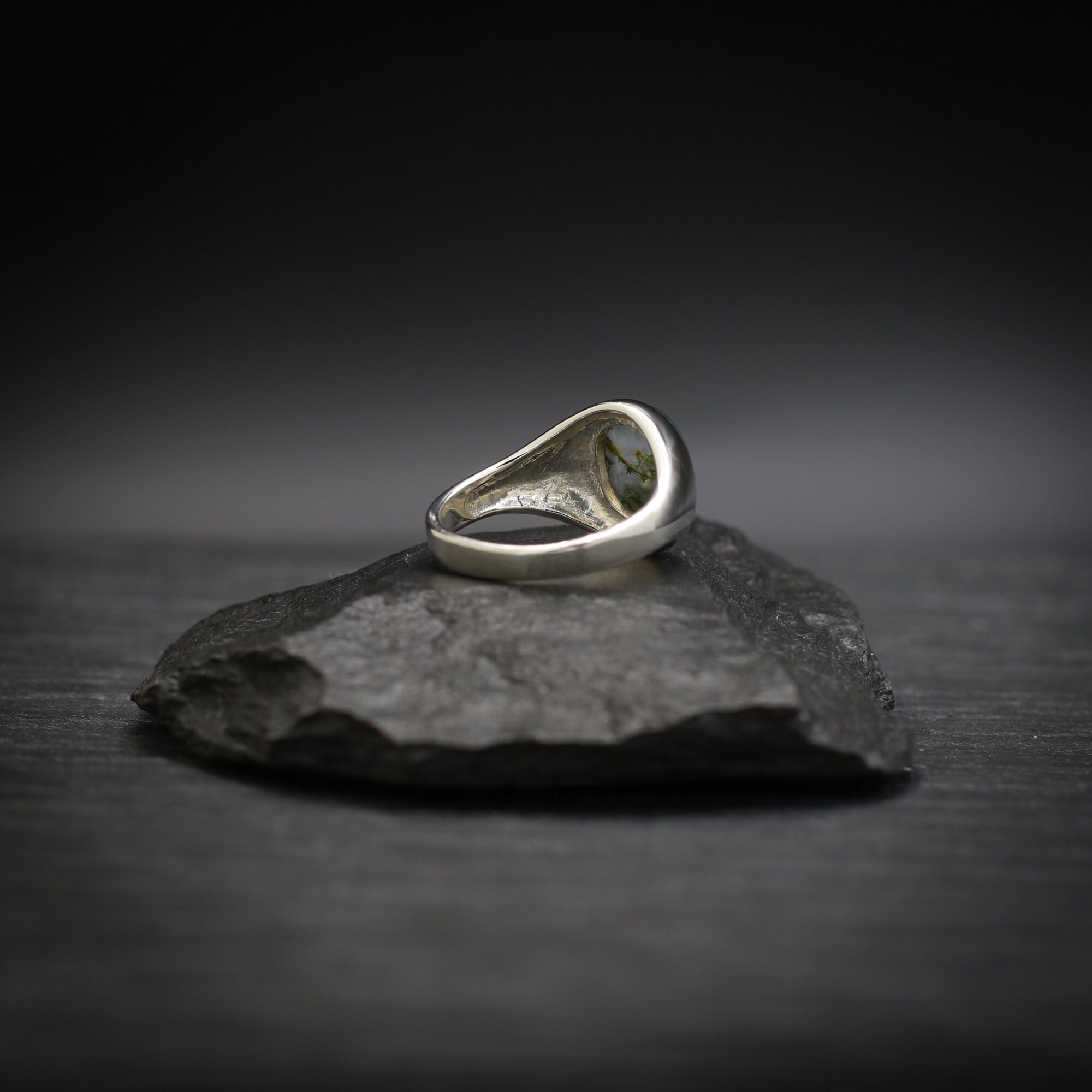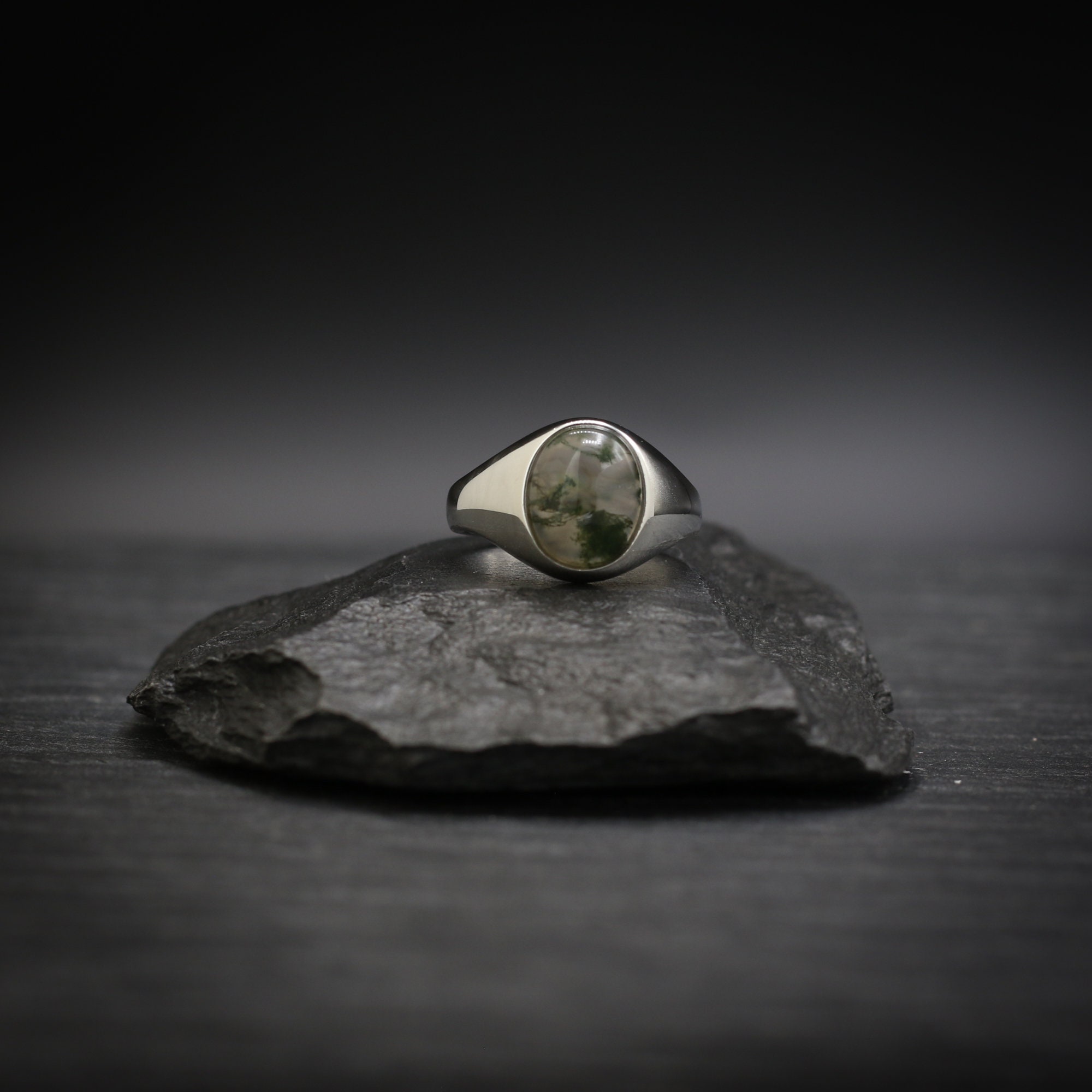 This is our stunning Moss Agate Signet ring. Made using high quality Sterling Silver and a gorgeous Moss Agate gemstone. These are perfect for someone looking for a classic ring, with a modern twist.